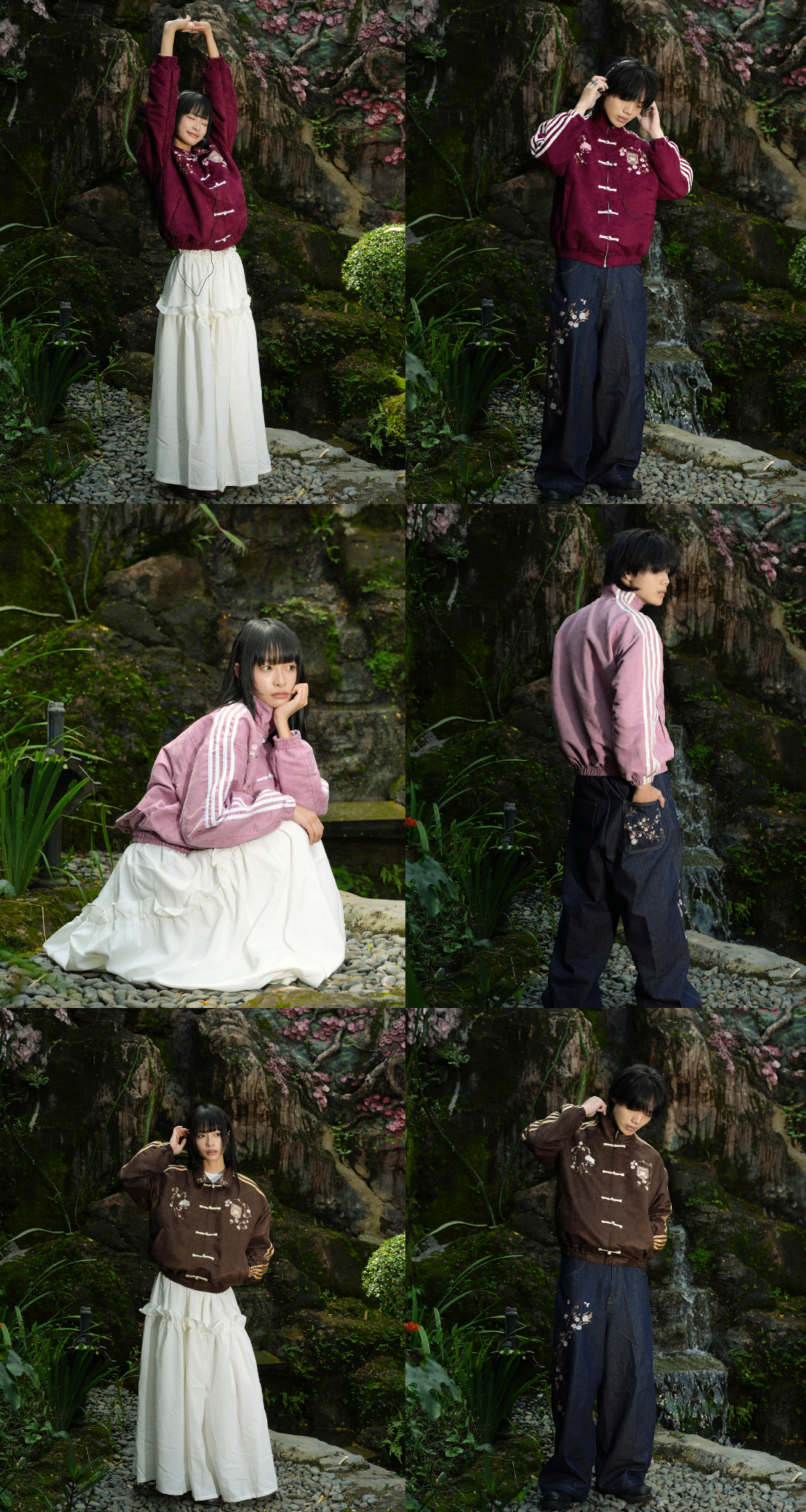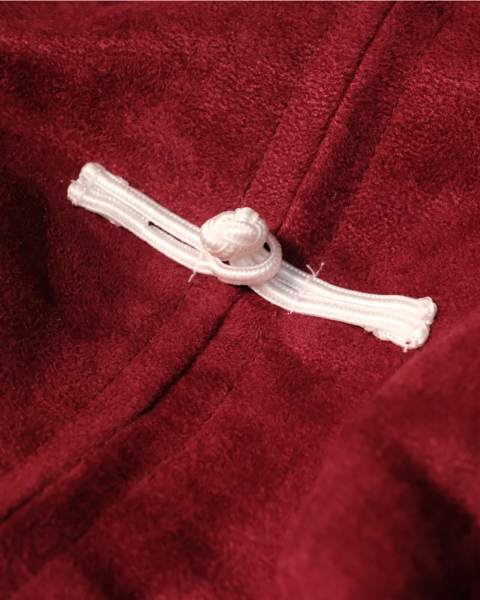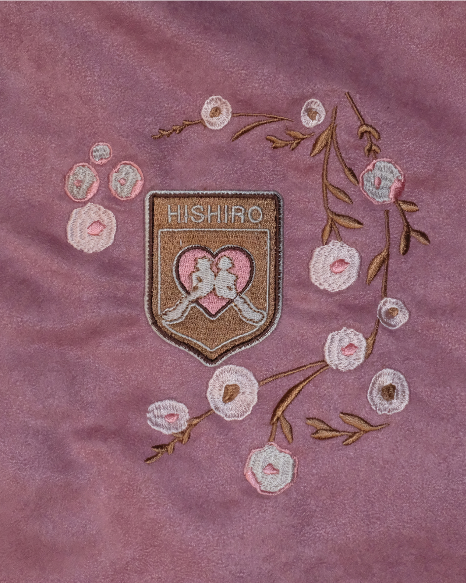 Designed with suede fabric, satin stripe accents, frog knot buttons, YKK zippers, sakura embroidery on the front, and finished with our custom Hishiro sakura lining.